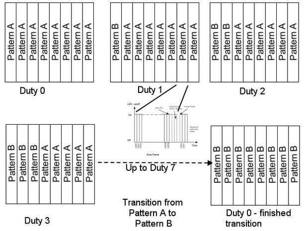 No es necesario tener LEDs individuales para ser controlado en los niveles de brillo distintos para hacer un fundido cruzado. Justo necesitaba el primer patrón con un brillo y el segundo con un brillo bajo. Entonces durante un breve periodo sería disminuir un poco el brillo de la primera y aumentar la segunda... esto sería seguir hasta el segundo modelo al completo. Entonces el reloj sería esperar hasta el siguiente patrón debía Mostrar y habría otra transición.