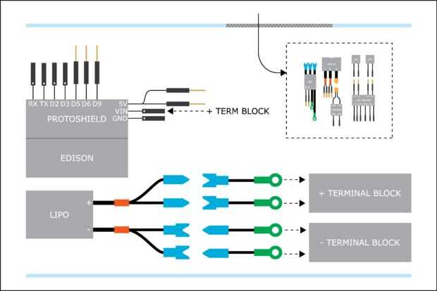 El tablero de Edison ROV continuamente espera para las comunicaciones de la tarjeta controladora, esperando caracteres de control sobre UART vía el balun. Dos pernos digitales de control el controlador LED y tres pines PWM se conecta a los pines de señal de los CES. El Edison regula la 11.1V de la batería a 5V para el conductor del LED y la cámara.