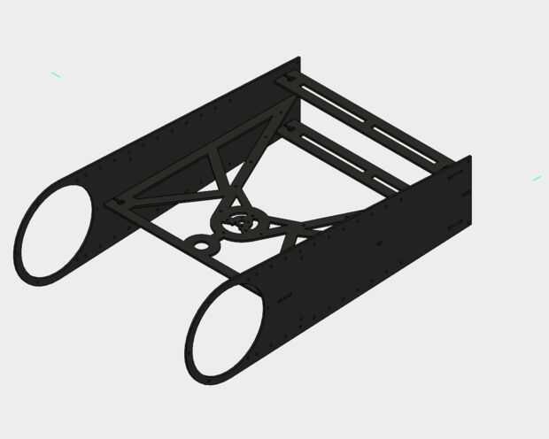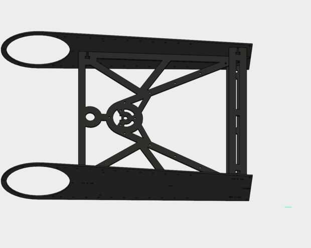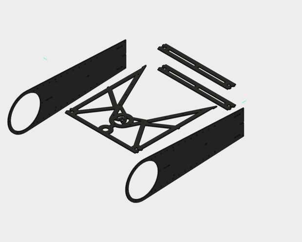 El cuerpo principal consiste en cuatro placas Delrin separadas que juntos del perno. Dos tornillos 6-32 x 3/4" fije el midplate a las placas laterales. Las placas de tensión trasero cada requieren su propio par de tornillos 6-32 x 3/4". Aunque no inmediatamente, cada placa lateral tiene una línea de agujeros espaciados uniformemente hacia el borde superior e inferior para ajustar la colocación de lastre o para colocar componentes adicionales. El marco es bastante flexible, pero llega a ser bastante rígido una vez que los tubos y la electrónica se atornilla en el marco.