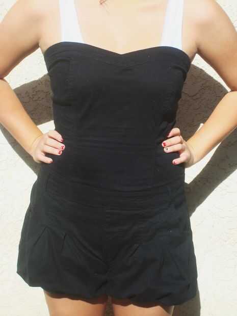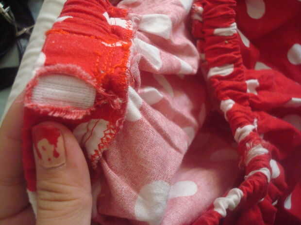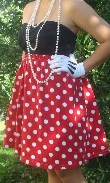 Primero, estoy usando los colores básicos cuando pienso en Minnie Mouse, que son negro, rojo y blanco. Era difícil encontrar un vestido entero que era rojo con lunares fui solo para una falda. Para la parte superior, puede llevar lo que quieras. sólo elegí este mameluco debido a la línea del cuello ligeramente dulce corazón además de los volantes en la parte inferior de dobles como un aumentador de presión de pequeño volumen para la falda. encontré esta falda en GOODWILL por $4.99, pero era demasiado grande. para hacer más pequeña me corte un corte en la cintura y sólo sacó la pretina elástica. luego cortado y lo nuevo juntos lo que ceñir.