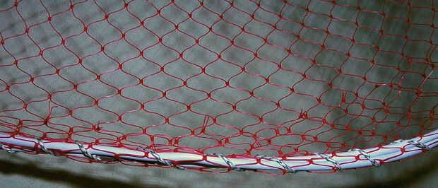 Coloque el aro de alambre dentro de la bolsa y doble la bolsa de red en el interior del aro. Use alfileres de ropa para mantenerlo en su lugar mientras se trabaja. Luego con una aguja grande (algo así como una aguja de tapicería) pase con la línea de pesca. Bucle de la línea de pesca alrededor del aro en forma de espiral para mantener la bolsa de red conectada a él.