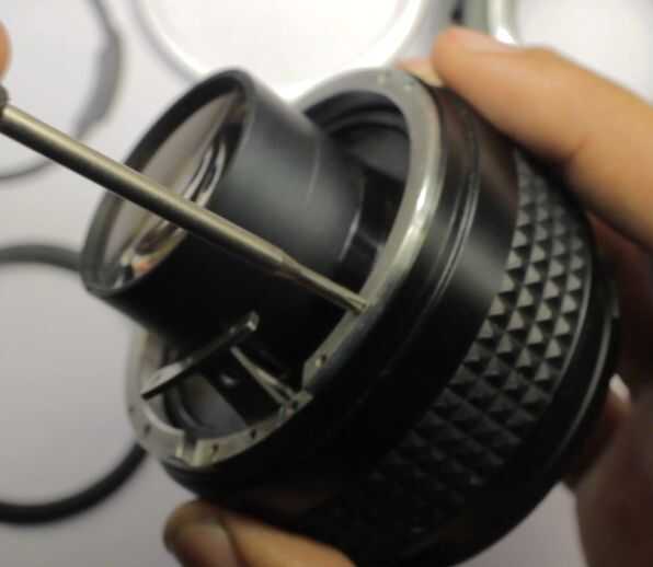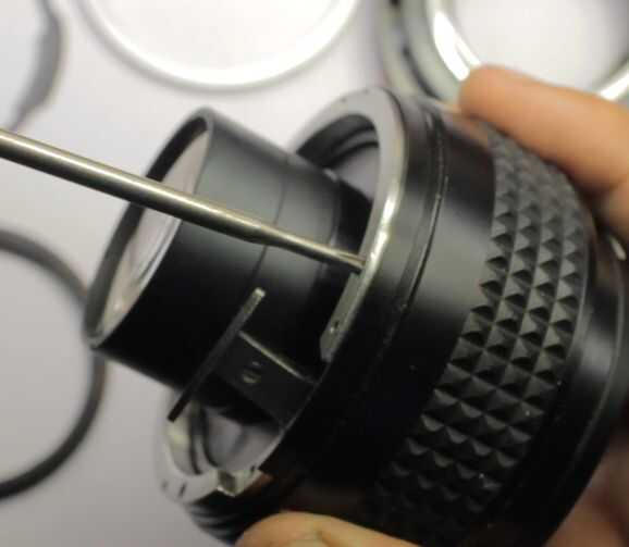 - Retire el tornillo de cabeza plana lateral, que proporciona duro paradas para el anillo de enfoque externo.