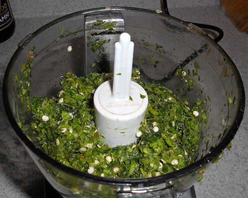 En un procesador de alimentos moler finamente los pimientos con la menta y dejar de lado