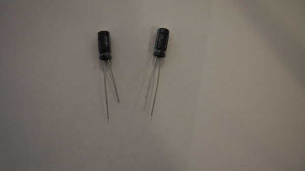 Estos condensadores son idénticos por lo que pueden ir en cualquier lugar del condensador electrolítico. Sin embargo, están polarizados, lo que significa que lo cual cable va en que agujero de cada condensador. Ambos tienen dos cables saliendo de ellos. El lado con el cable más largo es el + lado y entra el + agujero. El cable más corto del condensador es el lado - y entra en el - agujero.