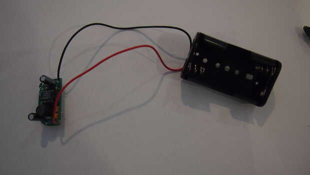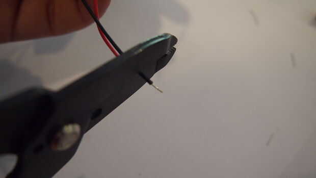 Ya se pelan los cables de soporte de la batería al final. Sin embargo, sólo una parte muy pequeña del alambre puede ser despojado, así que siéntase libre de utilizar un alicate para tira más. Estos cables se pueden dividir un poco, así que es bueno a trence los hilos del cable del mismo modo que es más fácil soldar. El cable rojo va en el + agujero en la parte inferior de la placa de circuito y el negro va en el - agujero.