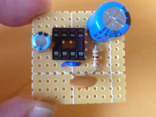 Siempre pongo en el IC primero y soldadura justo como voy, no importa el orden o disposición como se pega al esquema pero creo que mi diseño es agradable... tenga en cuenta que pin 2 y 4 del LM386 están conectados juntos. Prestar atención a la polaridad de los condensadores electrolíticos y asegúrese de que todo lo que necesita conexión a tierra esté conectado a tierra.