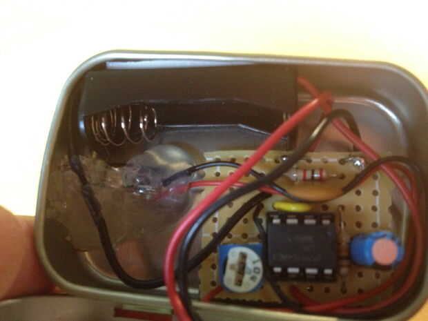 O usted puede fácilmente la casa al transmisor con una pila de 9 voltios en un tamaño normal lata Altoids. La ventaja de usar una de 9 voltios será evidente cuando usted comienza a grabar a través de las pilas A23 en 25 min jaja.