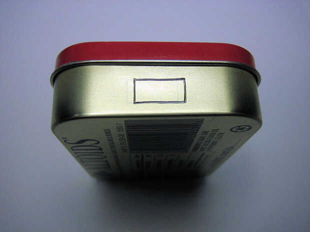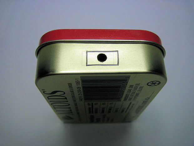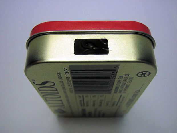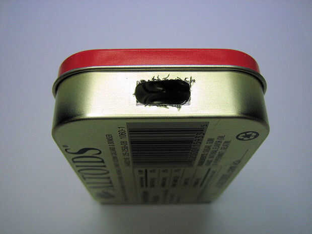 Corte un agujero en la lata Altoids para alojar el conector USB de la MintyBoost. El fondo del agujero debe estar nivelado con la parte inferior del conector USB después de aplicar la cinta de espuma. Aquí es cómo he logrado esto...