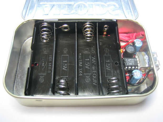 Aplique presión hacia abajo para hacer buen contacto entre la cinta de la espuma y la parte inferior de la caja. Apriete los lados de la lata Altoids para contrarrestar y doblez hacia fuera que pudiera haber originado de los curiosos le hizo para instalar la caja de la batería.