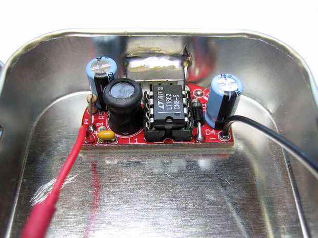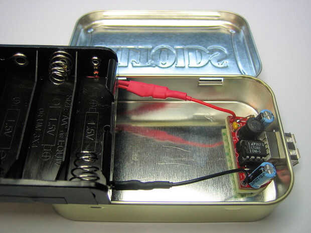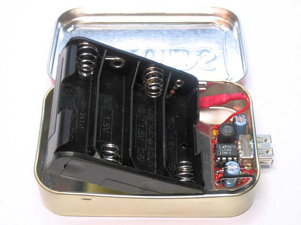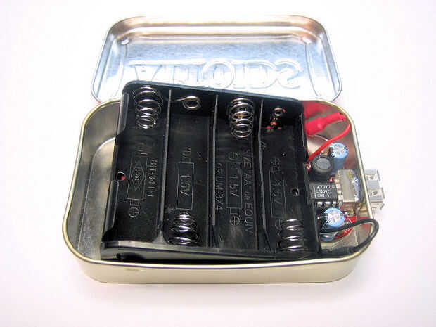 Instale el MintyBoost en la lata Altoids como se muestra. Dependiendo de cómo firmemente el conector USB se ajusta a través del agujero podría ser una buena idea no para exponer el adhesivo de la cinta de doble palo hasta que tenga el MintyBoost en su lugar. Con el conector USB que se pega a través del orificio puede inclinar hacia arriba la placa del circuito y retire el protector adhesivo agarrándolos con alicates de punta, pinzas u otra herramienta similar puesto que hay no ser mucha separación y luego pegarlo en el lugar.