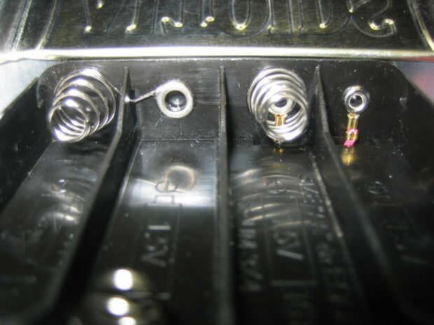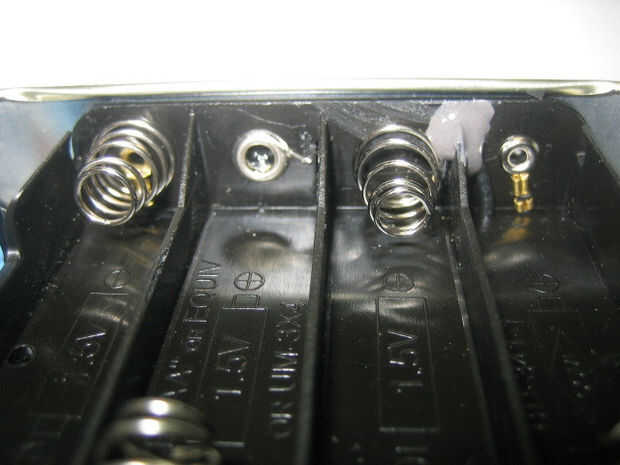 Como se puede ver en las dos primeras imágenes el portapilas se ajusta firmemente bajo el interior borde de la lata Altoids. Esto ayuda a mantener el soporte de la batería en su lugar. También se puede ver en la segunda imagen un ejemplo de uso de JB Weld para fijar el terminal modificado (del paso 8).