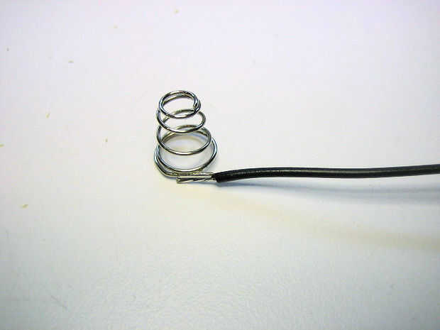 Quitar el resorte que nos liberó antes y sacar el extremo doblado recorte el cable en el punto indicado en la segunda imagen de abajo. Siguiente soldadura alambre un trozo de 22 galga trenzado de conexión de 3.5" pulgadas a la primavera como se muestra en la última imagen. Se recomienda utilizar alambre con aislamiento negro aquí puesto que se trata de la negativa (-) cable de alimentación para Banco de baterías dos. Utilizaremos este muelle y alambre en un paso posterior.