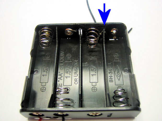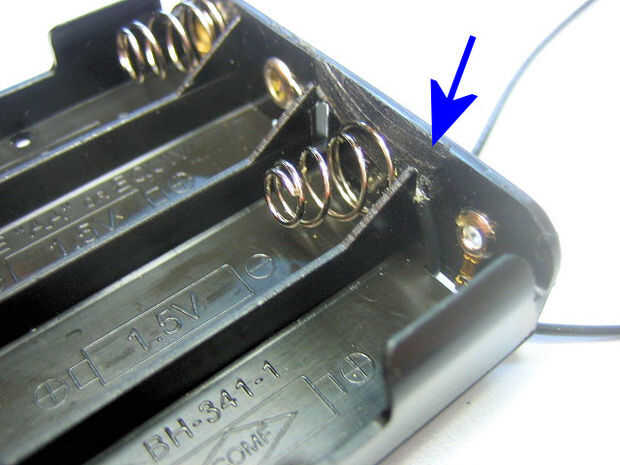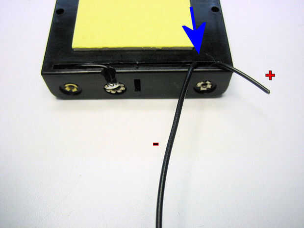 Lleva la terminal del muelle negativo que creó en el paso 6 y pase el cable a través del agujero rectangular en la parte inferior del soporte de la batería en el compartimento exterior al lado de la ranura que se corta solo. El cable se pasará al lado del cable conectado al remache como se muestra en la primera imagen a continuación.