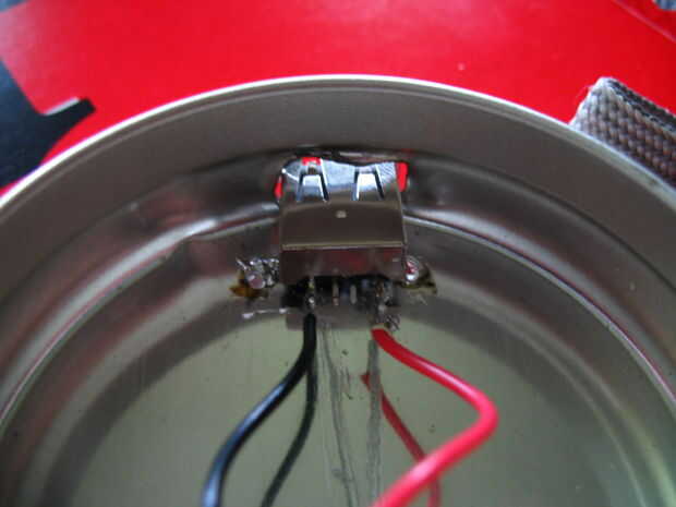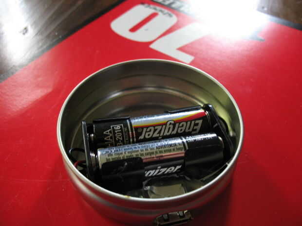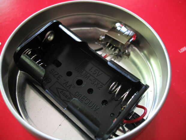 Finalmente, con algún pegamento o cinta de doble cara, fije el convertidor dentro de la lata Altoids. Una nota de PRECAUCIÓN: hay dos pernos expuestos en la parte inferior del convertidor boost, y si corta en la lata, el cargador no funciona! Asegúrese de poner un pedazo de cartón sobre ellos, o aislarlos de alguna otra manera.