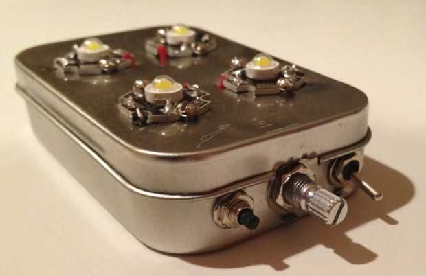 Este proyecto consiste de cuatro LEDs blancos de 3 vatios conectadas a una batería de LiPo de 7,4 voltios (2S) y dos 555 temporizadores. Un potenciómetro de 10K en el primer temporizador ajusta la velocidad de flash entre unos 2-20Hz. El segundo temporizador controla la duración del flash y se fija en unos 5ms.