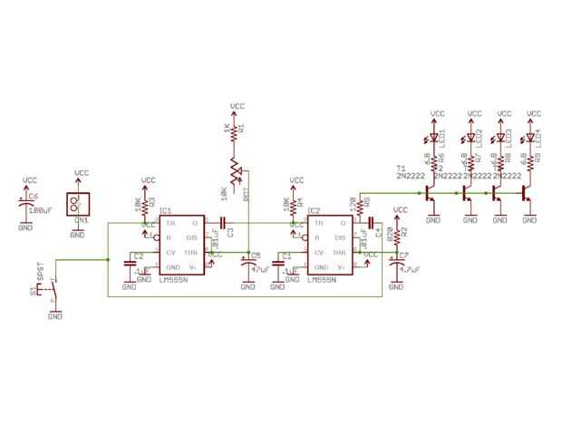 En este caso, he conectado la salida de cada temporizador a la entrada del otro, para que cuando se apaga el temporizador 1, temporizador 2 se convierte, que enciende los LEDs. Temporizador 2 tiene una resistencia relativamente pequeña (820 ohmios) y el condensador pequeño (4.7uF), así que la cuenta regresiva solo dura unos 5ms. Entonces apaga el LED, que causa el timer 1 comenzar su cuenta regresiva, que es el tiempo entre cada destello. Temporizador 1 tiene un condensador que es diez veces más grande (47uF) además de una resistencia fija de 1000 ohmios y una resistencia variable (potenciómetro) que oscila entre 0 y 10.000 ohmios, por lo tanto la resistencia total es entre 1-11K. Esto hace la cuenta regresiva del temporizador 1 duran entre unos 50ms y 550ms, o desde 20Hz hasta 2 Hz. (el resistor de 1 K está ahí para asegurarse de que incluso si la perilla se gira completamente hacia abajo, todavía hay suficiente resistencia para proteger el pin de descarga del 555).
