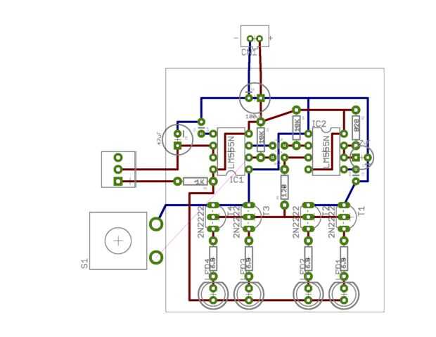 Quería que los destellos para ser lo suficientemente brillante como para iluminar una habitación oscura, por lo que utiliza cuatro luces LED de 3 vatios, cada dibujo unos 600 miliamperios. Puesto que el temporizador 555 puede sólo fuente de 200mA, usé salida de temporizador para activar un transistor de ensambladura bipolar NPN conectado a cada LED. He utilizado PN2222A transistores ya que puede recoger hasta 1 amperio, mientras que el 2N3904 similar tiene sólo una potencia de 200 mA. Asimismo, las resistencias de 6,8 ohmios son versiones relativamente grandes de 1 watt que necesitan para manejar más de la mitad de un amplificador. (Con 7.4V conectado a un LED blanco y una resistencia de 6,8 ohmios, cada resistor realmente es disipación de más de 2 vatios, pero puesto que son sólo de 5 ms a la vez, las resistencias no calientan incluso en la más rápida tasa de parpadeo). Usé una batería de LiPo de 2S porque tienen una alta tasa de C y fácilmente puede suministrar el > 2 amperios necesitadas.