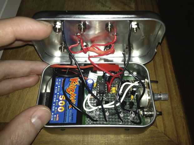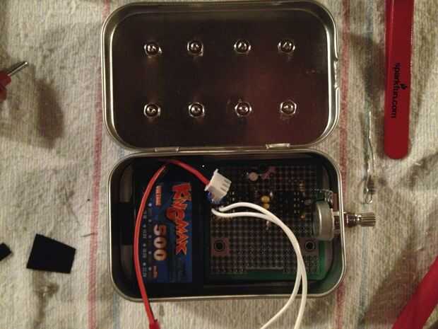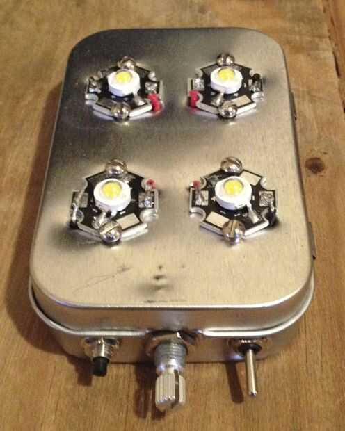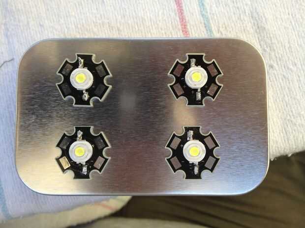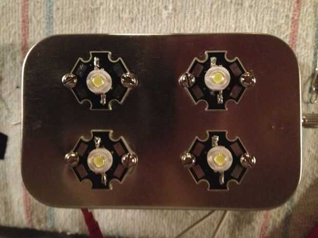 Espaciados los cuatro LEDs en la tapa de la lata, perforado dos agujeros para cada LED y ocho insertado 4-40 tornillos con tuercas en el interior a juego. Luego perforé dos agujeros más pequeños al lado de cada LED para los cables positivo y negativo. Los cables positivos están conectados por debajo e ir directamente a la batería. Los cables negativo se conectan a una resistencia de 1 watt diferentes que a su vez está conectada a un transistor y luego el pin de salida del temporizador 2.
