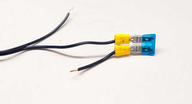 En el cable positivo corte aproximadamente 3 pulgadas más o menos y tira de un cuarto de pulgada o así fuera de ambos extremos. Un terminal a un extremo de la encrespadura. En el cable positivo restante todavía unido a la franja del adaptador de un cuarto de pulgada del aislamiento y engarzado en el terminal restante. Poner un terminal en cada cable del fusible. * Nota: utilice un fusible bueno. Ver cómo el fusible en mi foto se blown.* poner un trozo pequeño de cinta alrededor de los terminales de prensado para evitar cortocircuitos.