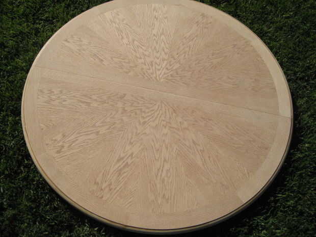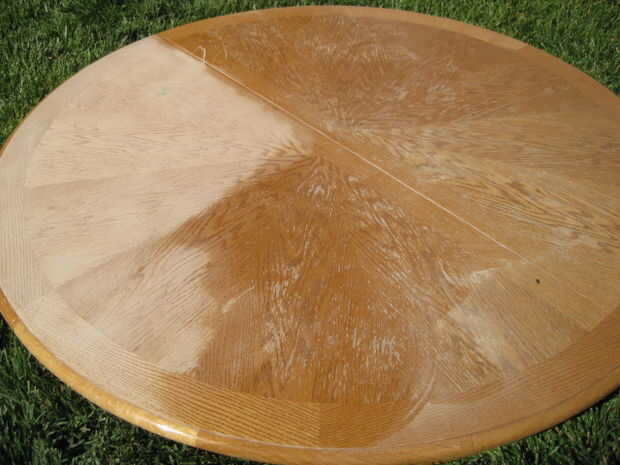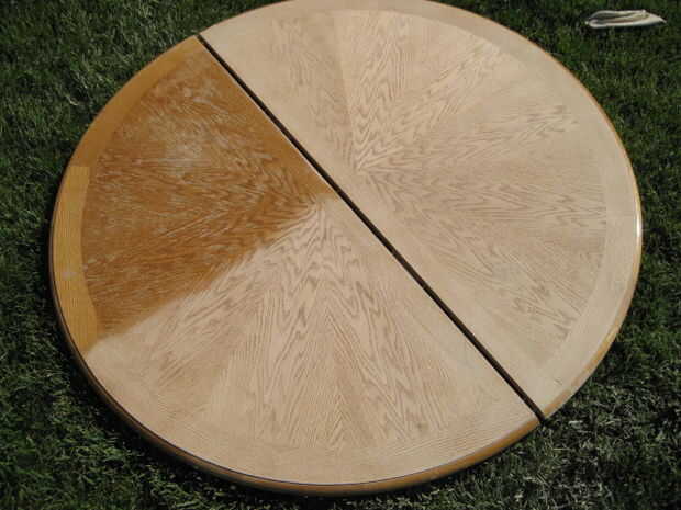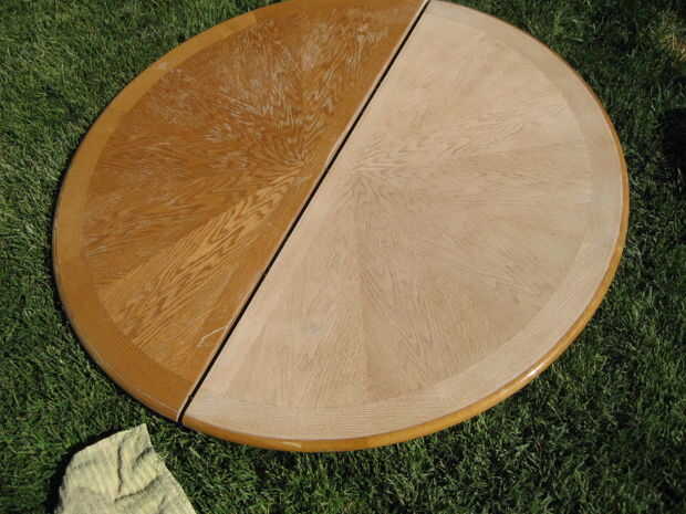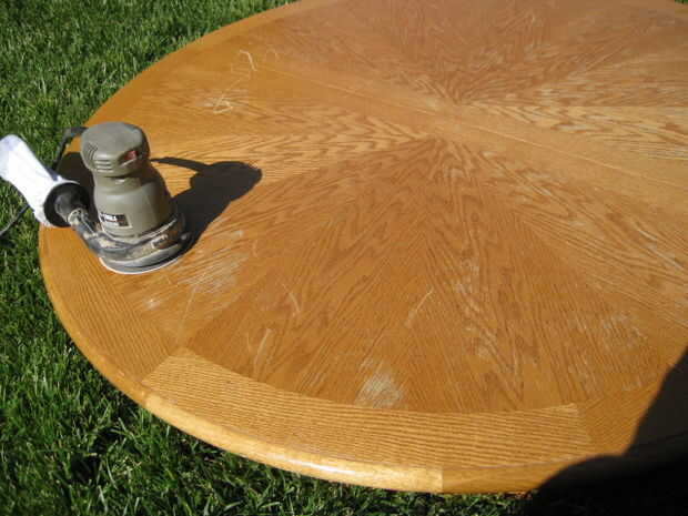 Continúe este proceso con la parte de atrás y adelante de movimiento hasta que la tabla esté completamente desnuda en la parte superior. Que es lo que quieres es madera desnuda! Como se puede ver que resultó bastante bien. En mi tabla tiene un borde curvado todo el camino alrededor de la circunferencia. Usé un disco antiguo a la arena para porque el borde no es amplia y la mancha no estaba tan gruesa es sorprendente. Así que ahora que su mesa es todo lijar usted puede relajarse porque es la parte más difícil. Puede haber algunas pequeñas aristas que puede ser que necesite atención pero puede volver y los hace a mano con los discos usados. Dése una palmadita en la espalda, los pasos son todos divertidos.
