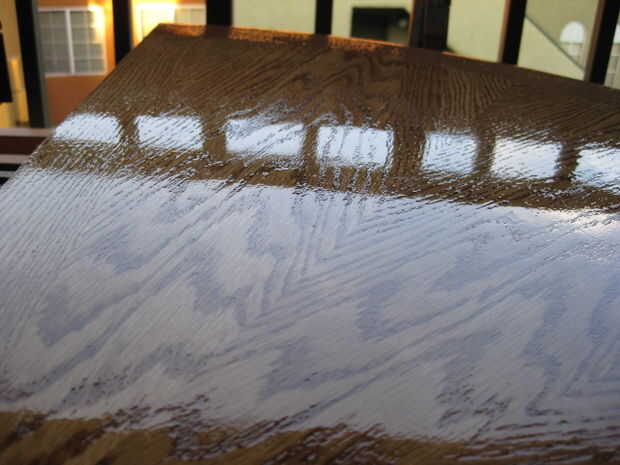 Después de lo que parecía para siempre, la 2ª capa de poly secado completamente. Finalmente llegó el momento de aplicar la capa final de poliuretano. Este es su tercer cepillo de espuma. A diferencia de la mancha, el poli convierte el cepillo de la espuma en un ladrillo durante la noche. Tan su bueno para estar preparados. Este es el paso más fácil pero más importantes. Es el producto final como se verá. Tomar el pincel fresco y repetir el mismo proceso que las dos primeras capas. Y con la capa final Asegúrese de que su distribuido uniformemente y sin ninguna raya. La forma más fácil no raya es no ejecutar en un pincel seco, sólo mantener lo real mojado y no tienes un problema. El producto terminado va a brillar tan fuerte que impresionará a cualquiera. Le dan otro día para curar y tal vez más depende el olor, como dije antes de que sea fuerte.
