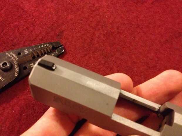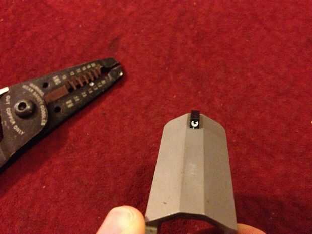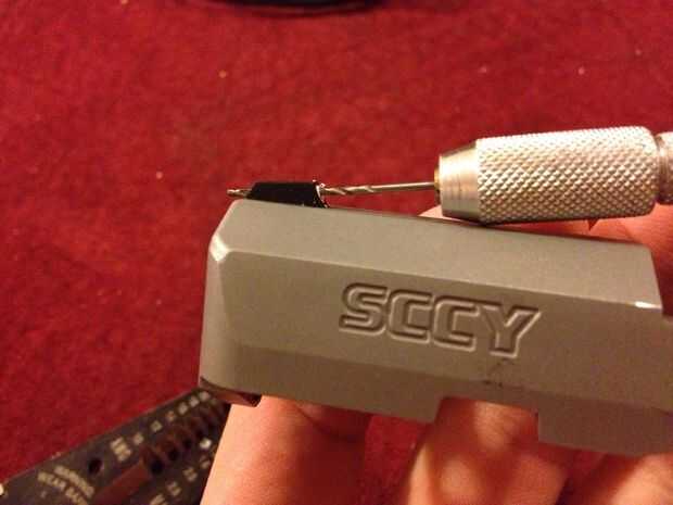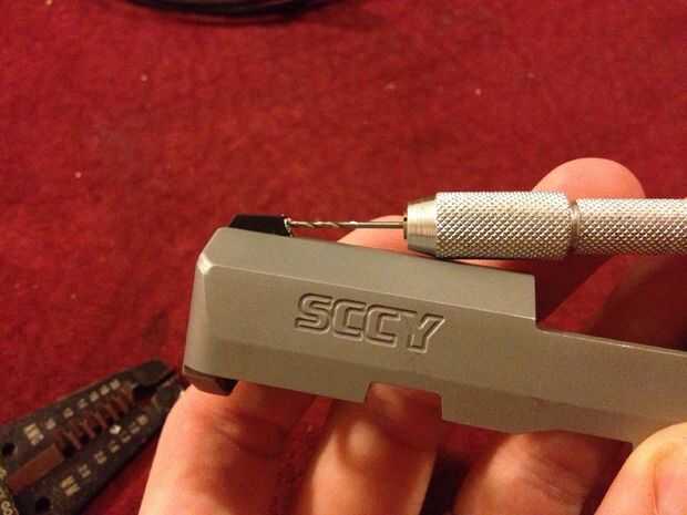 Mira originalmente tiene una chuleta pequeña en la cara posterior (hacia la parte posterior de la pistola) que está pintada de blanca. Empecé por una pequeña hendidura como cerca del centro de esa hierba de la perforación. Esta sangría evitará que la broca errante.