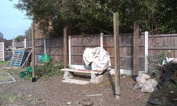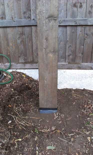 Cavaron agujeros de 30cm de profundidad y cada post en y llena los huecos con el suelo, apisonamiento para que sea tan sólida como sea posible. La distancia entre ellos es muy importante hacer bien hasta donde se colocaron dependía del tamaño del panel de techo. La bolsa de plástico debe estar por encima del nivel del suelo para que penetre en el agua debe ser menor.