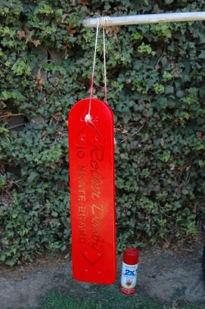 Ahora para la diversión parte! Comience a rociar la pintura roja en la placa. Asegúrese de que a la luz incluso capas por lo que la plantilla tira bien. No rush esta parte, tómate tu tiempo y aplicar el rojo en muchas capas finas hasta cubre completamente el tablero.