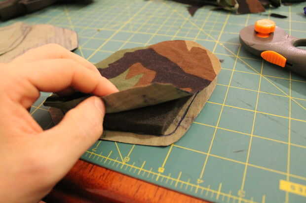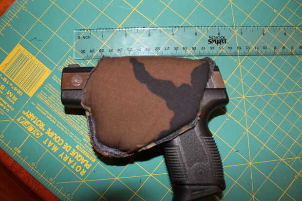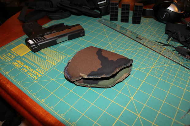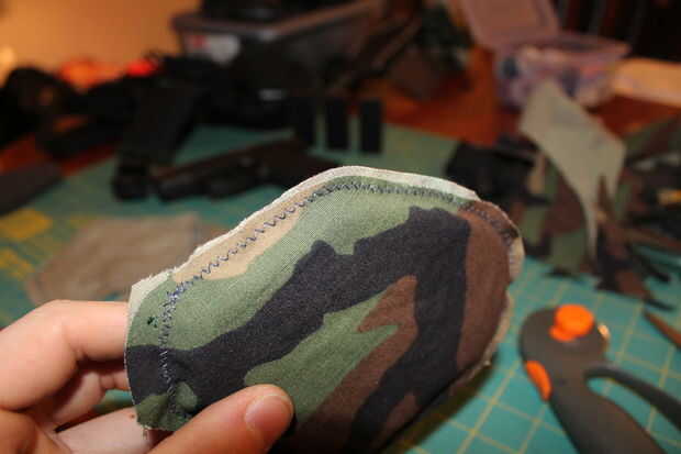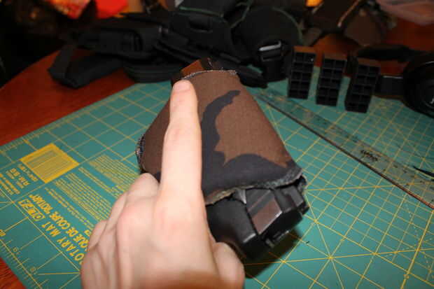 Simplemente hacer dos lados acolchados de la misma forma y tamaño y coser los dos lados juntos para hacer el bolsillo... una vez que se inserta su arma de fuego, marcar sus espacios y coser más para apretar y ajustar el koozie a su arma de mano...