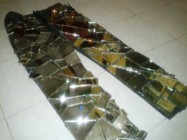 Aplicar una capa delgada de cola a la parte posterior del espejo y otra película fina en la parte del pantalón/chaqueta donde va pegado el espejo. Esperar de 2 a 4 minutos y luego presione el espejo y pantalón/chaqueta juntos. Continúe aplicando presión fuerte por aproximadamente 1 minuto y liberación, pero no se mueven. Continuar
