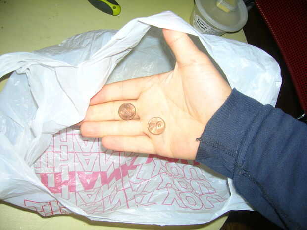 Poner sus dos centavos, piedras etc. en las esquinas inferiores dos de la bolsa. Pellizcar a su alrededor como se muestra. Espere pacientemente hasta que el siguiente paso.