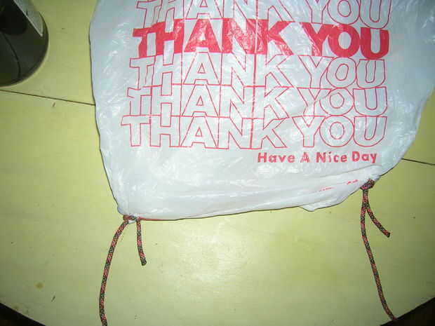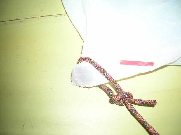 Coloque cada "lazo" alrededor el cuello descarnado debajo del centavo que hayas colocado en la bolsa y apriete. Hacerlo en ambos lados. Ahora debe tener una bolsa con el mismo cordón atado a cada esquina. Casi ahí!