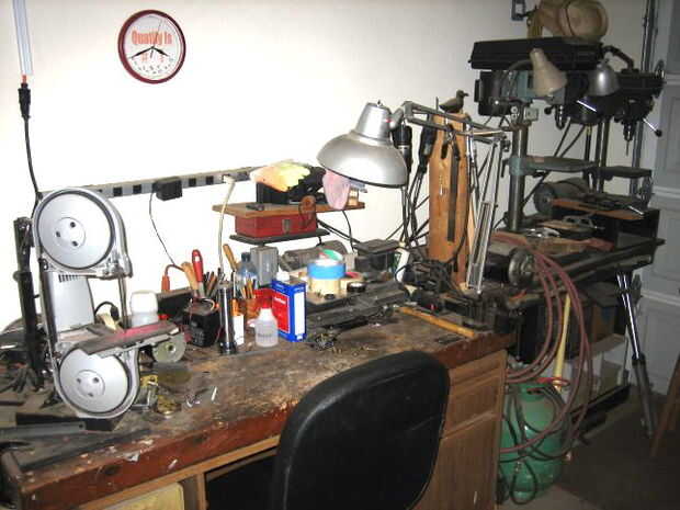 La foto de abajo es de mi mesa de trabajo en la tienda. No tiene mucho espacio en el por el momento, pero puedo acceder a mi sierra de cinta para corte de metales, un vicio pequeño y tres herramientas de eje flexible rotatorio sin salir de mi silla.
