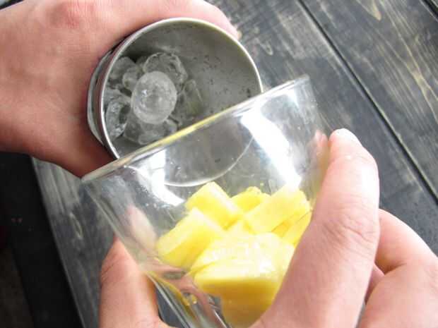 3. Introduzca cubitos de hielo y cubitos de piña la coctelera así.