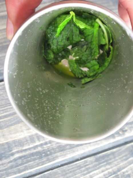 2. colocar hojas de menta en la coctelera y aplastar a los.