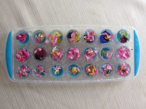 Como se puede ver en el primer paso, hay algunos cubos de hielo de bella flor en vez de cubitos de hielo normales. Son muy fáciles de hacer así. Comprar un paquete de flores comestibles, lavarlas y ponerlas en la bandeja de hielo antes de verter en el agua.