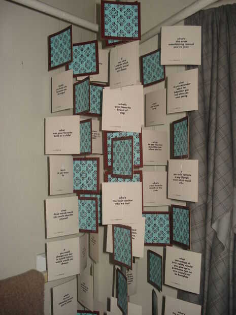 Y creé un flotante móvil tejiendo algunas lineas de pesca claro a través de unas tarjetas de TableTopic.