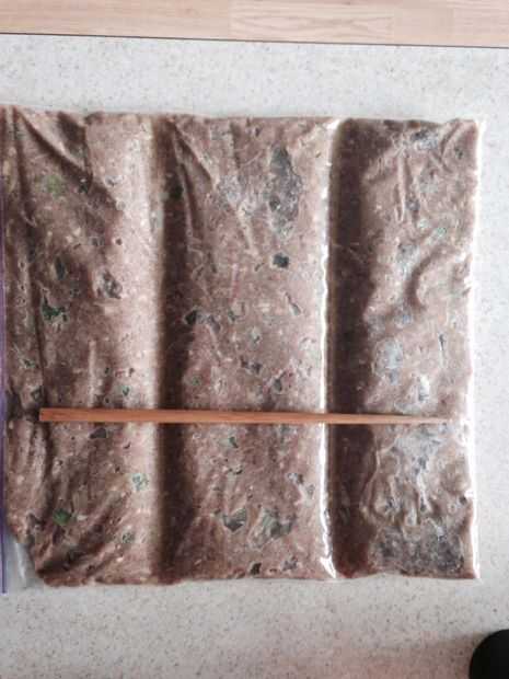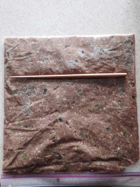 D. usted puede utilizar cualquier tipo de palillo como utensilio para este siguiente paso (uso un palillo). La bolsa se dividen en nueve 9 hamburguesas. Hazlo unas cuantas veces, con el fin de dejar una impresión.