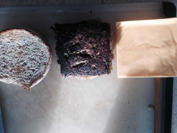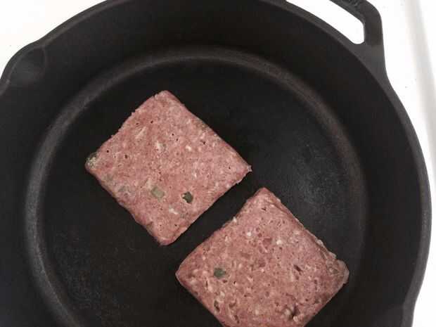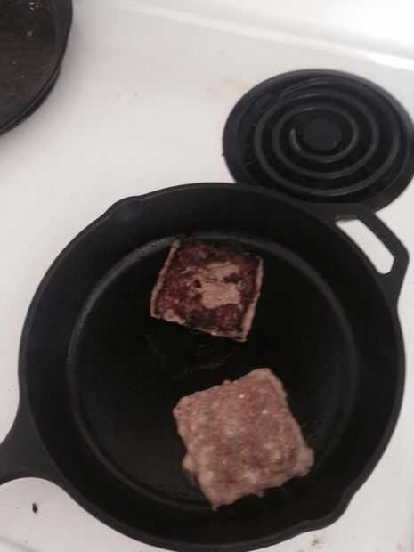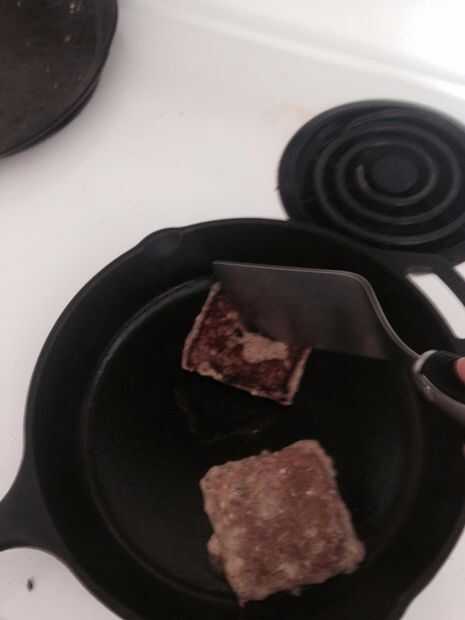 B. Retire el plástico y tiro las hamburguesas congeladas en una sartén o a la parrilla a fuego medio. Cocinar rápido y sólo necesita 3 minutos máximo en ambos lados si el pan ya está caliente y la carne no está completamente congelada. Si se congela, sólo mantener un ojo en él.