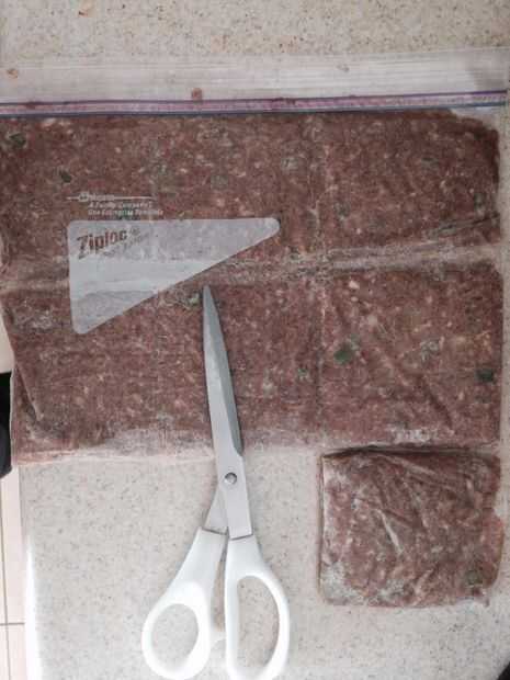 A. tomar la carne del congelador cuando su listo y cortar unas empanadas con un par de tijeras.