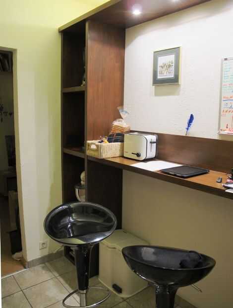La cocina es estrecha y consiste en un lado izquierdo con todo el material de cocina (horno, encimera) y el lado derecho con mi cocina-barra-despensa-serie. Usted puede ver la parte de "barra" del lado derecho de la cocina. Esto también es un DIY y requiere mucha planificación como no podía llegar tan pesada madera cortar en casa. Para que todas las dimensiones que encajan perfectamente. La parte de "despensa" falta en la foto, pero se compone principalmente de sistema IKEA-armario enmarcado por la madera oscura pintada que usé para el bar-cosita (cortar los agujeros para las luces era realmente un lío – madera dura espesor de 4 cm y sólo un taladro y una sierra de calar...). Pero no hay verdadera buena iluminación...
