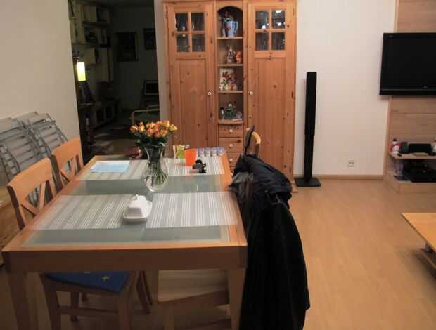 Utilizar la sala de estar sobre todo para el cartón o coser orientado al DIY. No hay mucho que decir acerca de éste. Lo usamos para la cena, demasiado, así que tengo que limpiar e interrumpir mis proyectos por lo menos una vez o dos veces al día para hacer algo de espacio para las comidas. Creo que mi esposa no le gusta realmente herramientas y restos de madera en la mesa del comedor, pero sobre todo le gusta lo que sale de mi DIY. Otro de ellos es el home-cinema-furniture-you-don't-get-anywhere. Es básicamente una unidad de montado estante de la pared donde va la placa base (hecha de madera sin tratar) desde el piso hasta el techo con la pantalla plana en el centro (se puede ver en el lado derecho de la imagen). La placa base también esconde todos los enredos de cables.