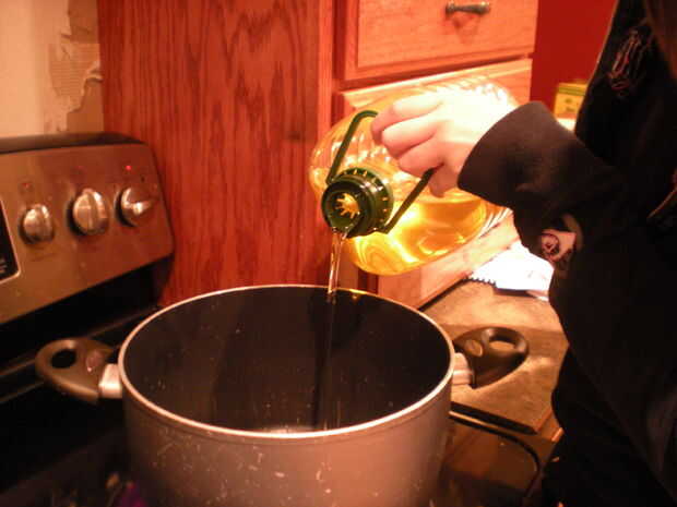 Tomar la olla grande y colóquelo en la estufa. Gire la estufa a sobre medio alto o alto. A continuación, vierta el aceite de oliva o vegetal en la olla para que casi completamente cubre la parte inferior entera de la olla. PLOP en cerca de 3 coroneles de palomitas de maíz y esperar hasta que aparecen.