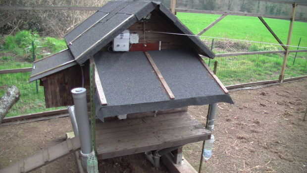 Hice este coop para los seis pollos. Cuenta con dos refugios dentro y cinco cajas de anidación. (Uno de mis pollos es un gallo). Hice una agua protector para la tapa de la caja de nidificación mediante el uso de alguna barrera de vapor y para calafat