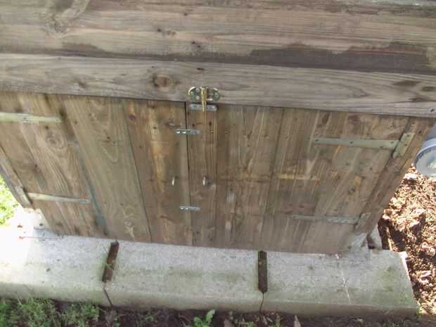 En la parte inferior, se instala una doble puerta para el acceso del "sótano" donde he instalado una bandeja con una mezcla de arena y cenizas de la chimenea donde mi rollo en puede ser protegido incluso si el tiempo es lluvioso. Esta mezcla es seca y les encanta rodar en...