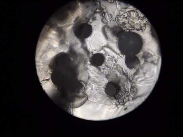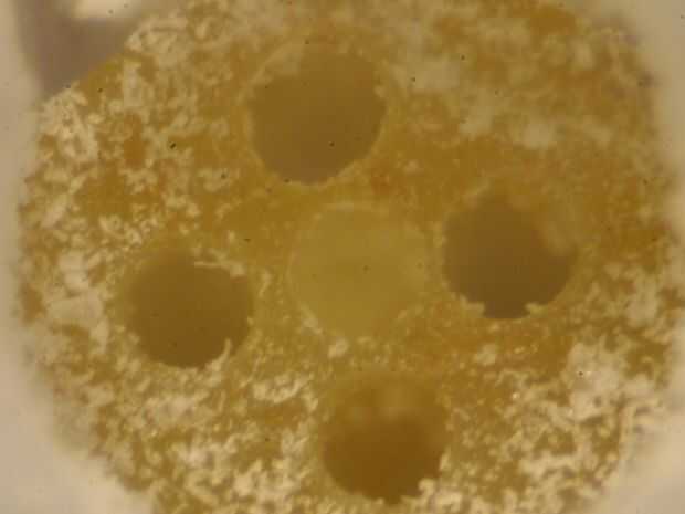 En la foto arriba es el CNC, mecanizados andamios con hielo seco, la unidad de control motor, espaguetis y andamios después del mecanizado, los agujeros son 300 micras de diámetro. Sí es 5 orificios longitudinales abajo un pedazo de espagueti (fotos tomadas con microscopio estéreo). Finalmente terminado andamio (transparente), los dos agujeros grandes son la más pequeña posible con la técnica de moldeo, y los 7 han sido CNCed y 300 micras de diámetro.