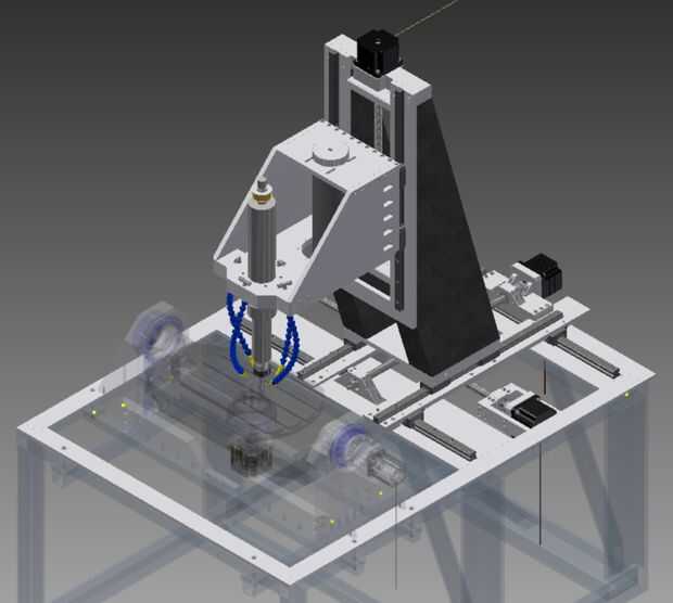 La máquina tendrá un 18 x 15 x 15 pulgadas área de trabajo con 150 y 360 grados de libertad en el respectivo eje de rotación A y B. Estoy con los mismos tornillos de bola de tierra de Aerotech en el molino de 3 ejes Y y Z y comprar un tornillo de la bola similar para el eje X. Todas las guías lineales son rieles THK HSR o HR 25 o 20mm. Para la A y la B, tengo dos reductores de alfa 61: 1 con 4 puntos contacto cojinete de bolas engranajes cabezas (menos de 3 minutos de brazo, +-.0001 grados de reacción). Estoy comprando un controlador CNC USB MK3 Ethernet/USB para el sistema de control y utilizando 5 controladores de PDS-13 paso a paso de parker. Para el eje tengo un husillo de 10.000 RPM con pinza ER25 y un servo de bucle cerrado de 5000 RPM dirigido por 2:1 para la energía (el servo de retroalimentación de lazo cerrado permite grabar los agujeros con los golpecitos y roscas con otras herramientas similares). Estoy usando un controlador servo cepillado y servo AMP para alimentar el motor. También he decidido invertir en un refrigerante completo soplado y sistema de nebulización, impermeabilización y y en un mínimo de agua se añadirán resistencia a todos los componentes en el área de mecanizado. Sistemas de policarbonato protección y refrigeración colección encierran la máquina.