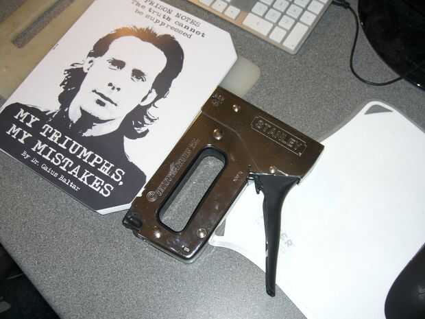 Pelar el libro de la tarjeta de madera y doblarse las grapas para sujetar todo en su lugar (tome nota de su libro profundidad y grapa la longitud antes de grapar)