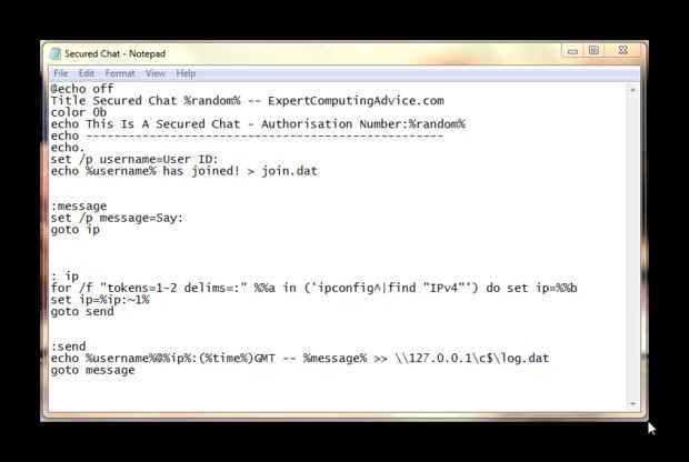 Puede sustituir mensaje % >> log.dat con log.dat como que guarde el archivo en la misma carpeta funcionaría tha programa de chat.