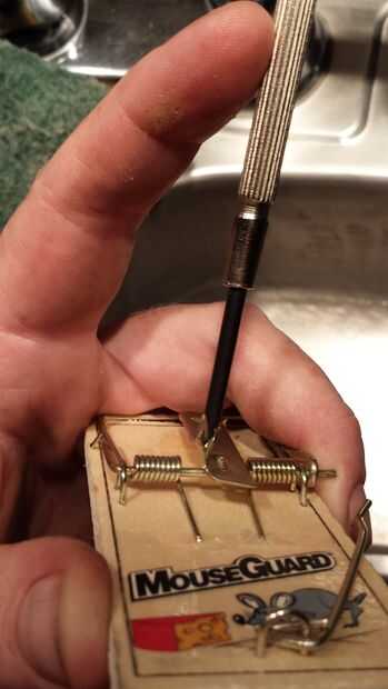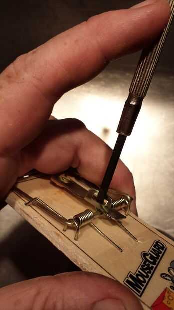 En general, hay sólo seis piezas a una trampa de ratón pero sólo vamos a ocuparnos de dos o tres; la placa de gatillo y el pin keeper. Fig 1 que yo estoy sosteniendo la placa de disparo para mostrar el área debajo de él, es donde se 'debe' colocar el cebo. Fig 2. Te recomiendo revisar el retén de la placa de disparo donde se conecta el pin keeper. Como esto normalmente se mantiene en su lugar por la tensión de la barra de la muerte, puede mantener el dedo contra él con una presión considerable pero asegúrese de que la fuerza aplicada es perpendicular a la base de la trampa. Esto le permitirá saber cómo de difícil será el gatillo una vez que la trampa se 'carga', así que usted puede conseguir derecha sin arriesgarse a romper un dedo. Fig 3 y Fig 4 muestran cómo ajustar la captura en la placa de gatillo. Mayoría de las veces, si el pin keeper no quiere coger y sostener contra la tensión de los dedos [o la barra de resorte cargado kill] entonces es simplemente una curva leve es todo lo que necesita - como estoy tratando de hacer con el destornillador. Encontrar que alrededor del 35% de estas trampas requieren ajuste un poco, sólo para llegar a trabajar... pero estos son el'cheapo de todos modos.
